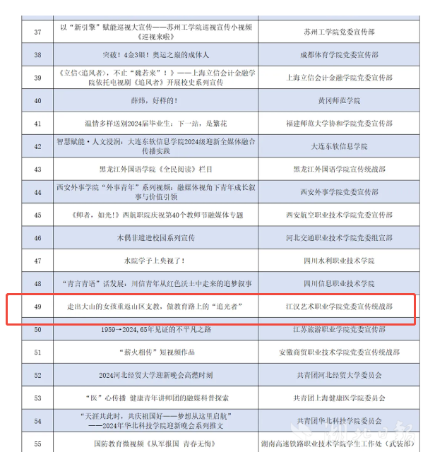 此次评选活动由中华出版促进会教育新闻出版专业委员会联合中国教育电视协会高校电视专业委员会共同开展,旨在梳理教育融媒体建设年度成果、推广先进实践经验。活动吸引了全国广大教育新闻从业者的积极参与,经过行业专家多维度审核与综合评议,最终确定入选名单,江汉艺术职业学院的作品《走出大山的女孩重返山区支教,做教育路上的“追光者”》,以真挚的情感表达与鲜明的价值导向脱颖而出
