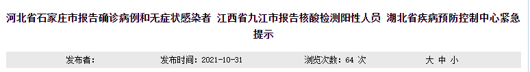 10月31日,河北省石家庄市深泽县报告1例新冠肺炎确诊病例和1例无症状感染者,江西省九江市柴桑区报告1例新冠病毒核酸检测阳性人员。为科学精准防控疫情,严防疫情输入,现对广大群众提出如下疫情防控建议: