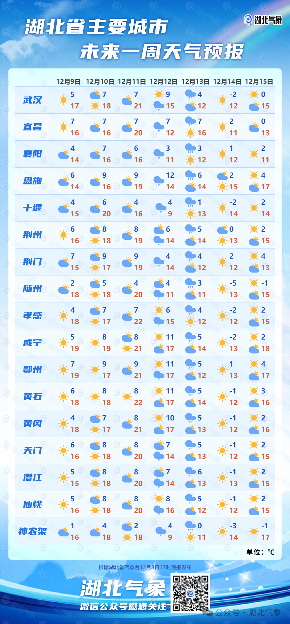 12月9日08时-10日08时,全省晴天到多云,夜间恩施地区局地有零星小雨。最高气温14~19℃,最低气温2~7℃,偏东风2到3级。