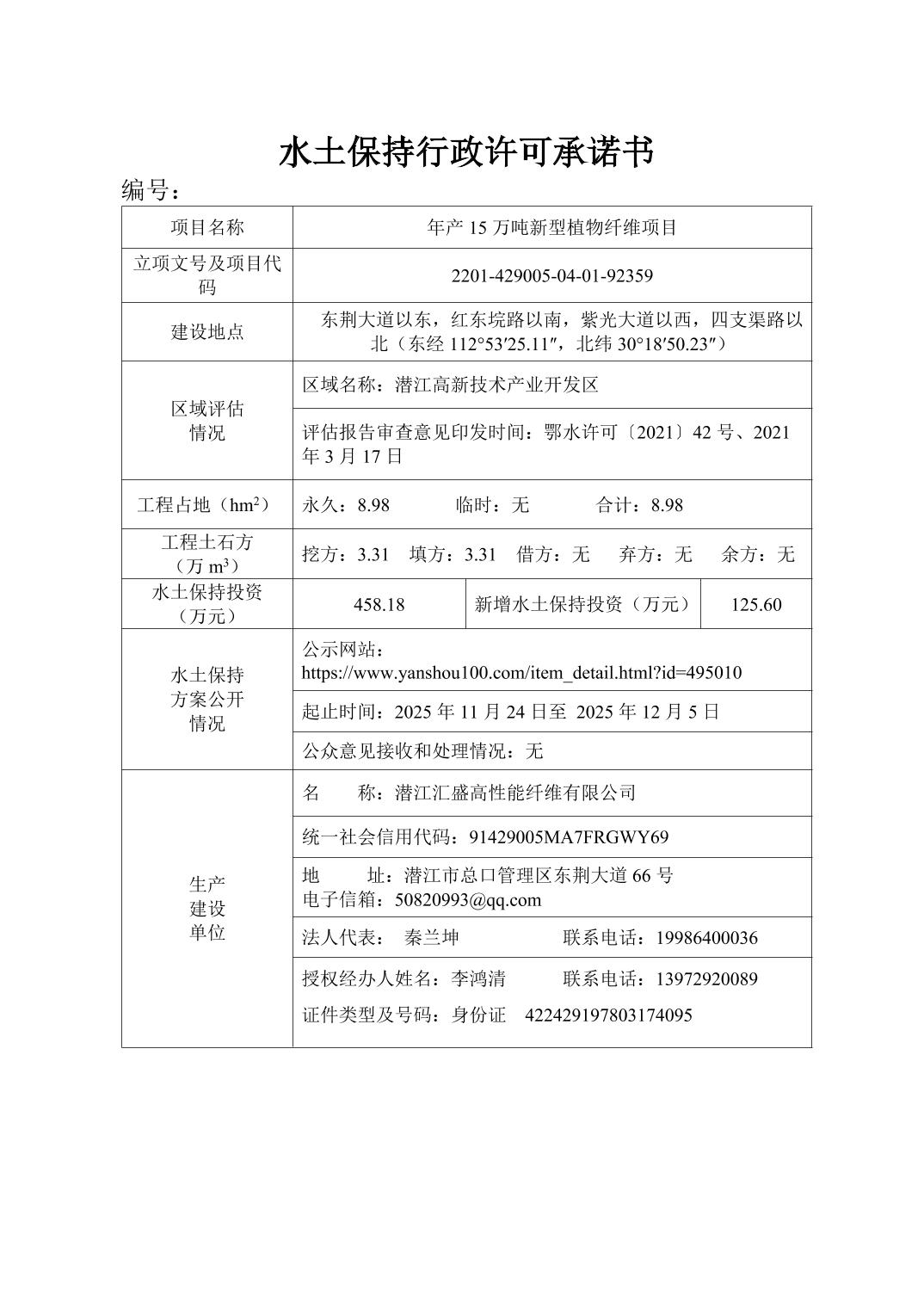 潜江汇盛高性能纤维有限公司年产15万吨新型植物纤维项目水土保持方案许可