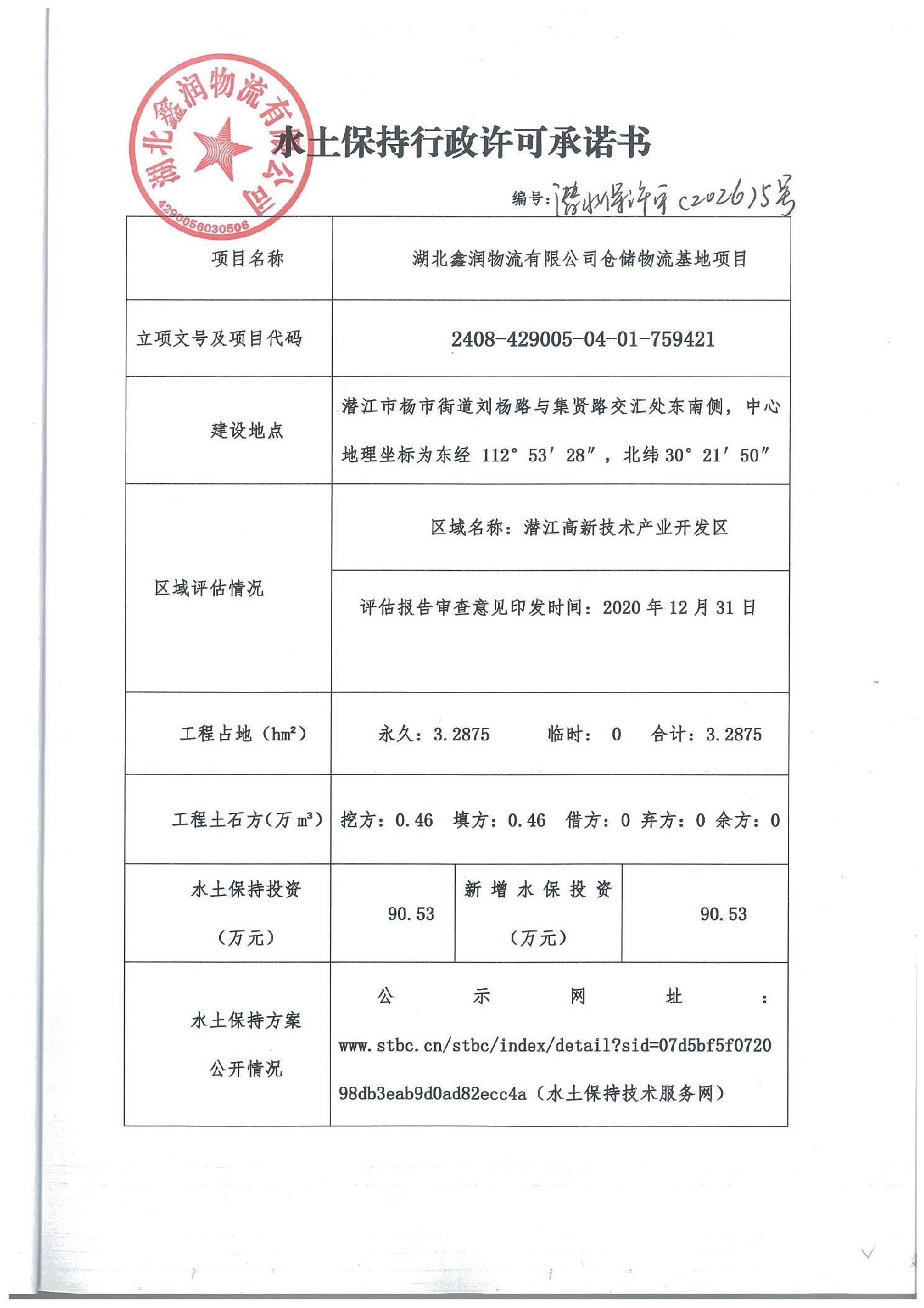 名 称: 湖北鑫润物流有限公司仓储物流基地项目水土保持方案许可
