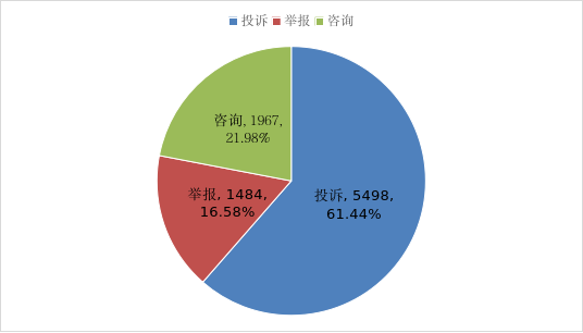 (一)投诉较上年同期增幅最大。除投诉较上年同期呈上升趋势外,举报、咨询较上年同期均呈下降趋势,投诉增长10.38%(见图三)。