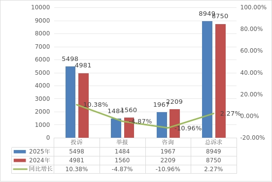 2025年,消费者总诉求量比上年同期上升了2.27%。呈现以下特点: