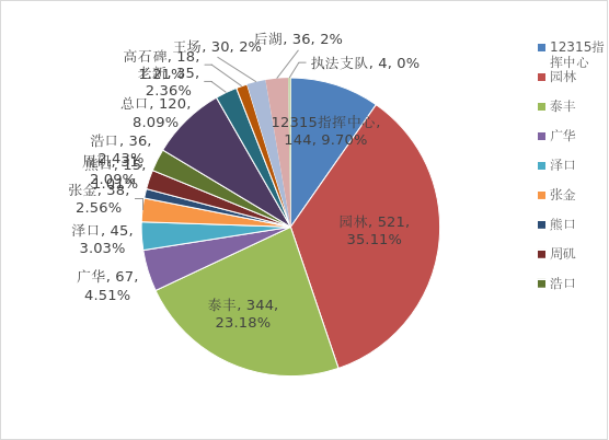2025年,全市系统受理的诉求除由12315指挥中心直接处理的3183件,其他诉求由执法支队和市场监督管理所办理。执法支队和监管所办理诉求5766件,占诉求总量的64.43%,园林市场监管所(2804件)、泰丰市场监管所(1295件)、广华市场监管所(346件)承办的诉求量在各单位中排名前三(见图五、表一)。
