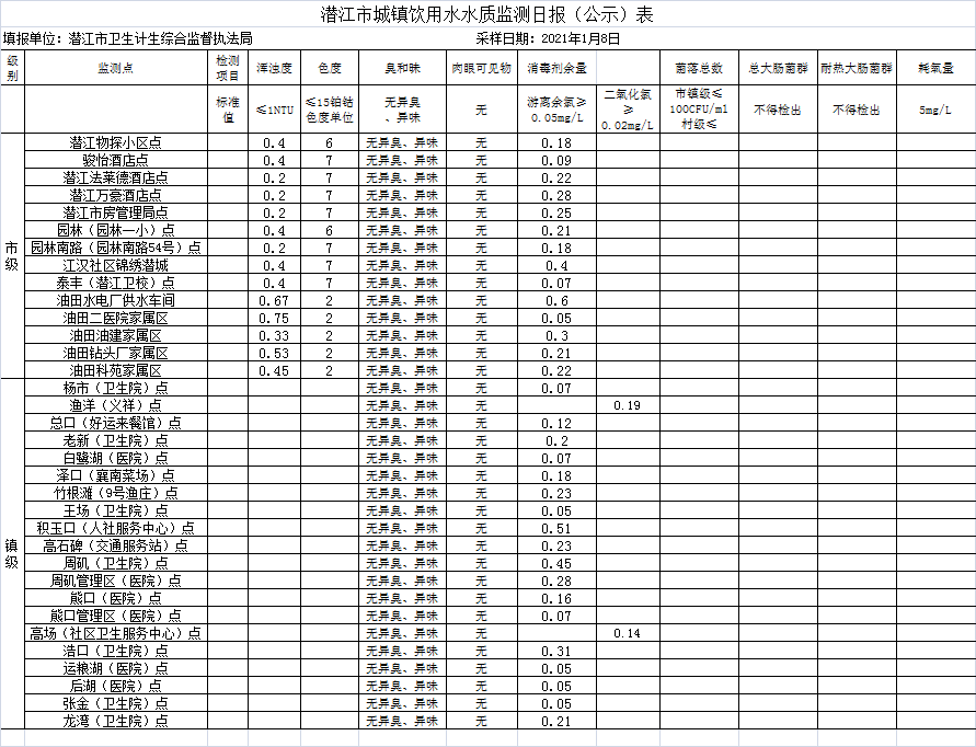 潜江市城镇饮用水水质监测日报(公示)表(2021年1月8日)