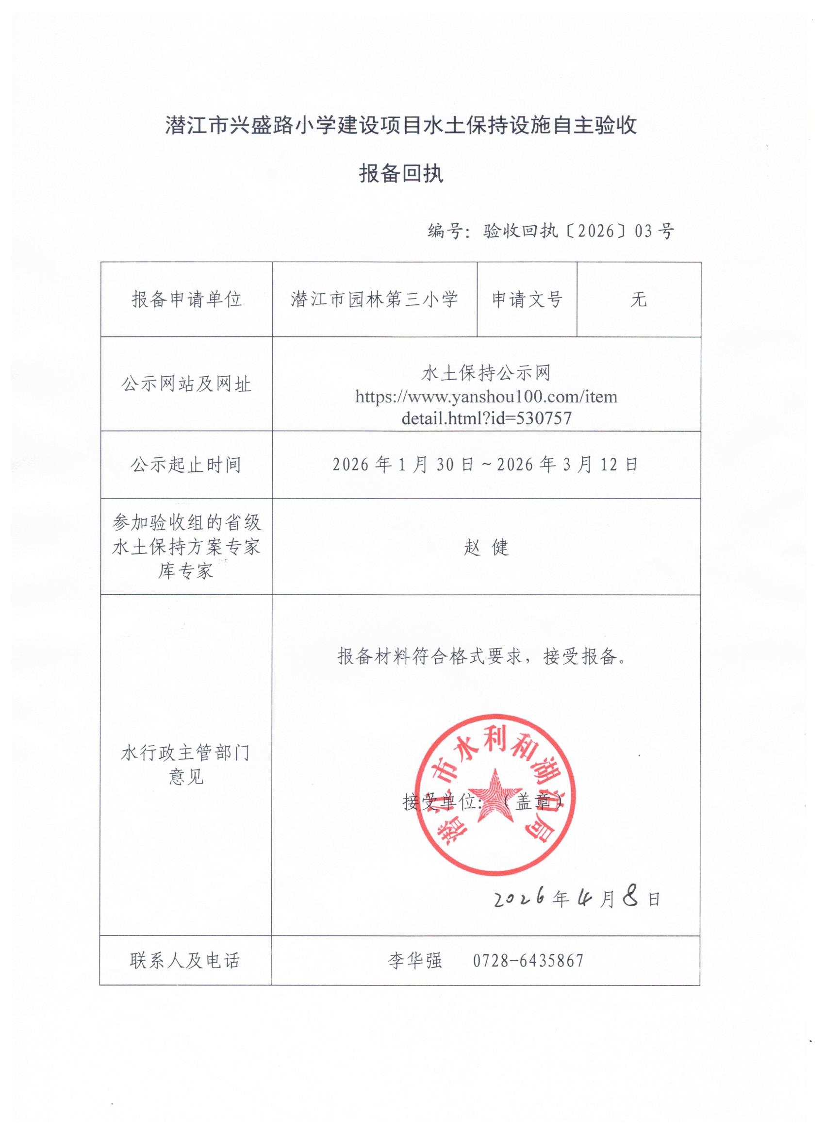 潜江市兴盛路小学建设项目水土保持设施自主验收报备回执