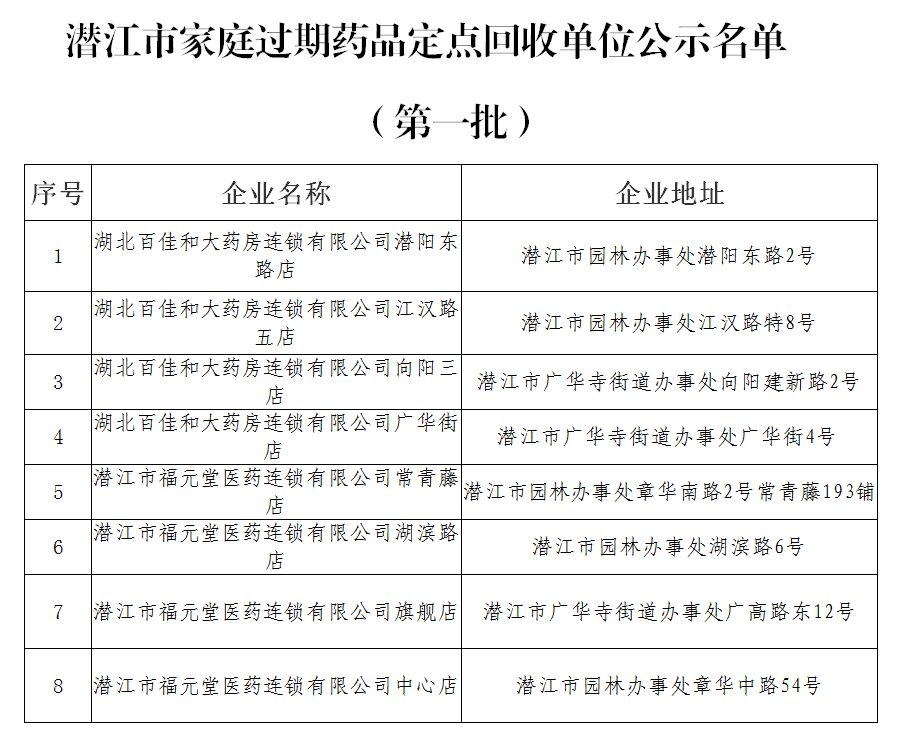 为进一步关注民生,服务百姓,切实守护人民群众生命健康安全,不断提升药品安全保障能力,根据《潜江市家庭过期药品回收工作实施方案》的通知要求,遵循自愿申报、公开、择优的原则,确定以下8家药品经营企业为我市家庭过期药品定点回收单位,现予以公布。