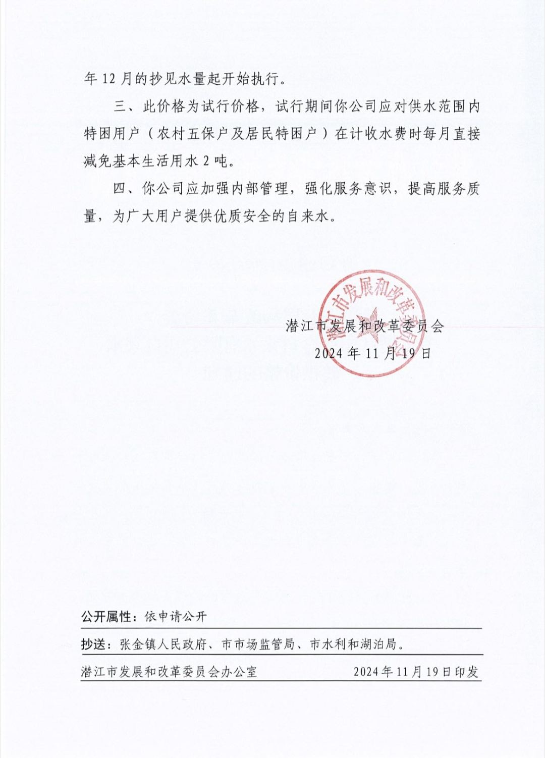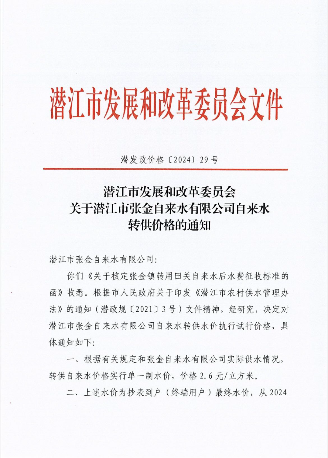 一、根据有关规定和张金自来水有限公司实际供水情况,转供自来水价格实行单一制水价,价格2.6元/立方米。二、上述水价为抄表到户(终端用户)最终水价,从2024年12月的抄见水量起开始执行。三、此价格为试行价格,试行期间对供水范围内特困用户(农村五保户及居民特困户)在计收水费时每月直接减免基本生活用水2吨。四、加强内部管理,强化服务意识,提高服务质量,为广大用户提供优质安全的自来水。