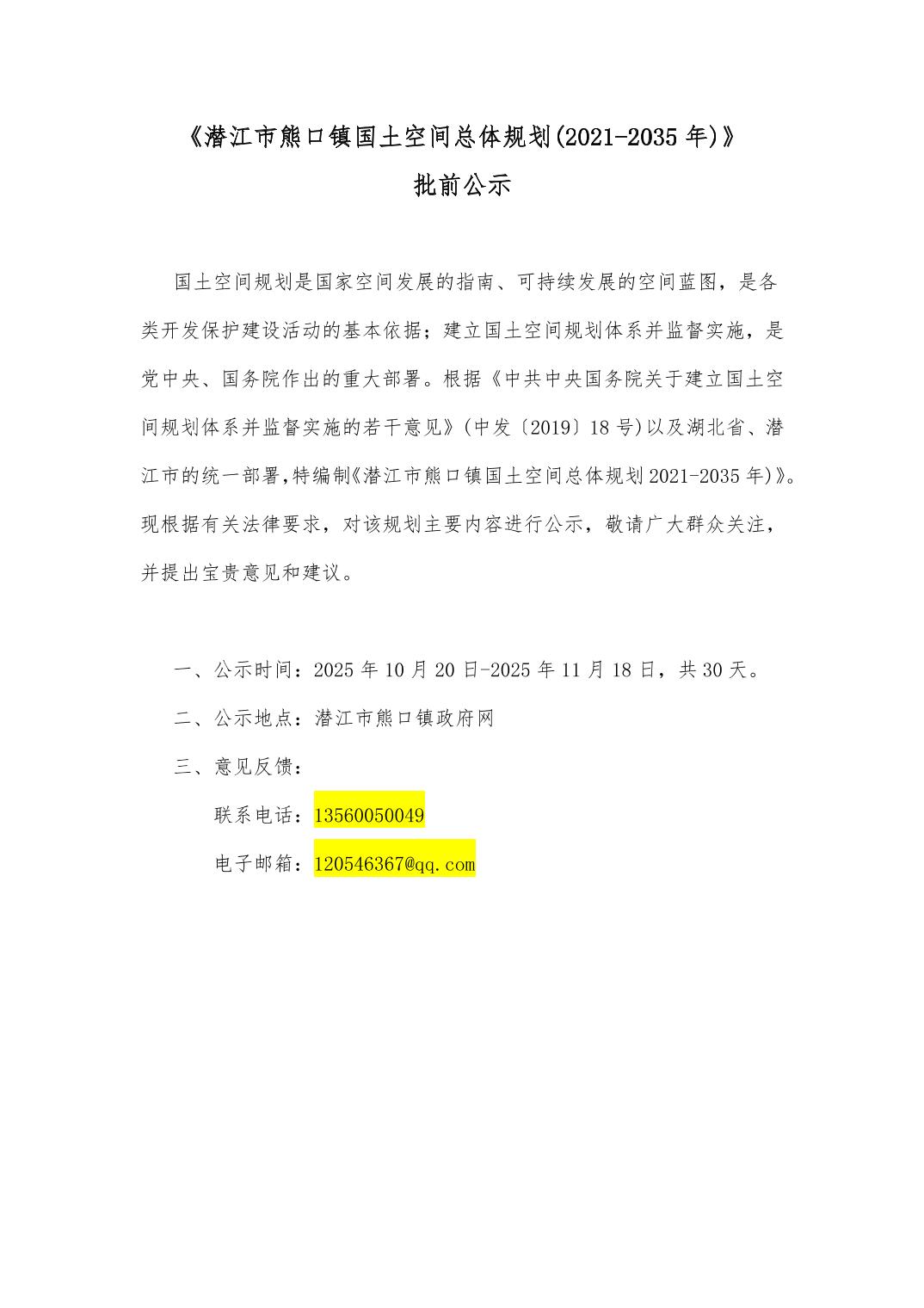 《潜江市熊口镇国土空间总体规划(2021-2035年)》批前公示