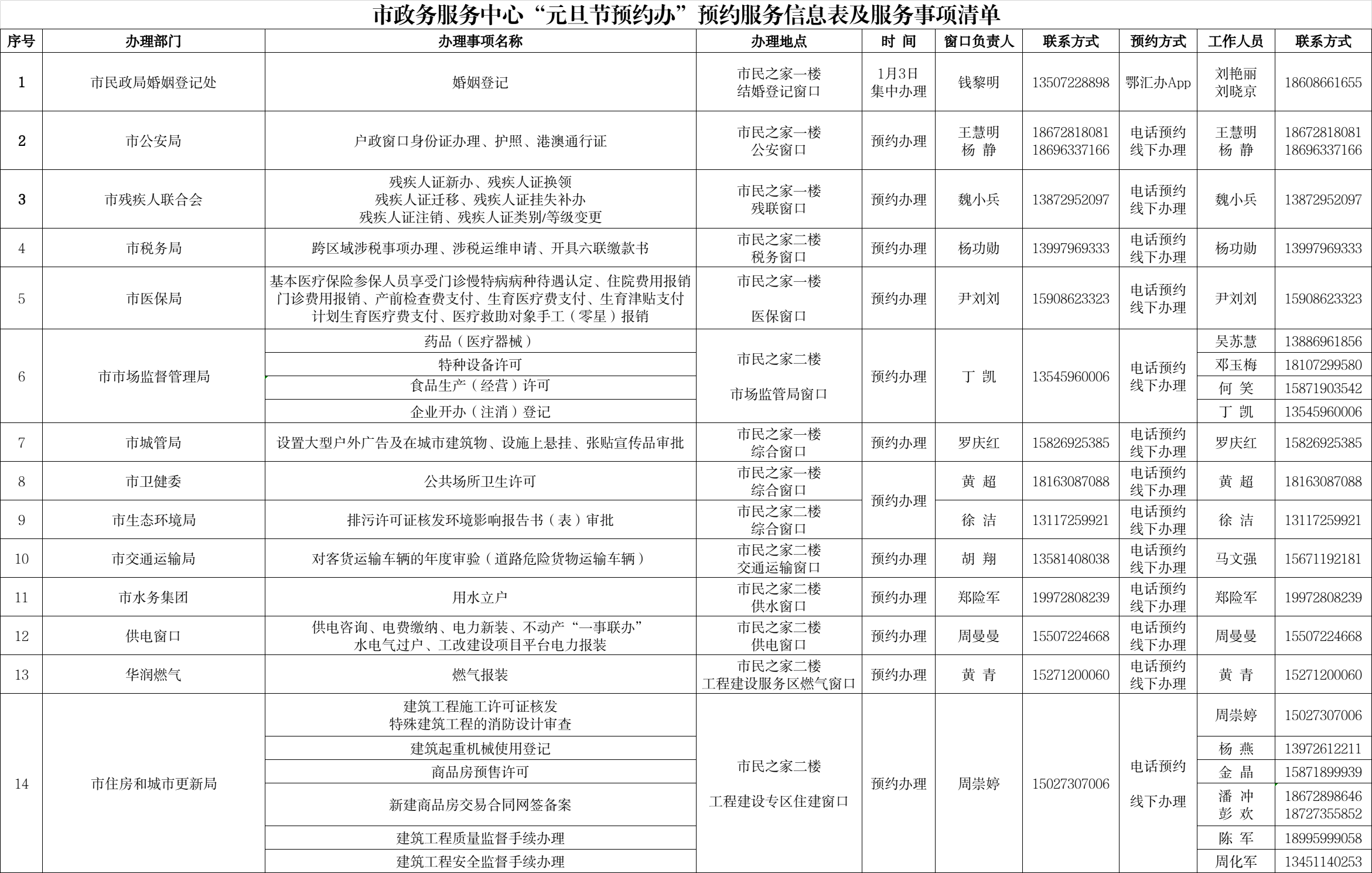 您可以查阅市政务服务中心“元旦节预约办”服务事项清单,该清单中详细列出了相关业务单位的联系电话。当您有任何疑问或需要预约线下办理业务时,请直接拨打清单中对应业务单位的电话进行咨询或预约。由此给您带来的不便敬请谅解!