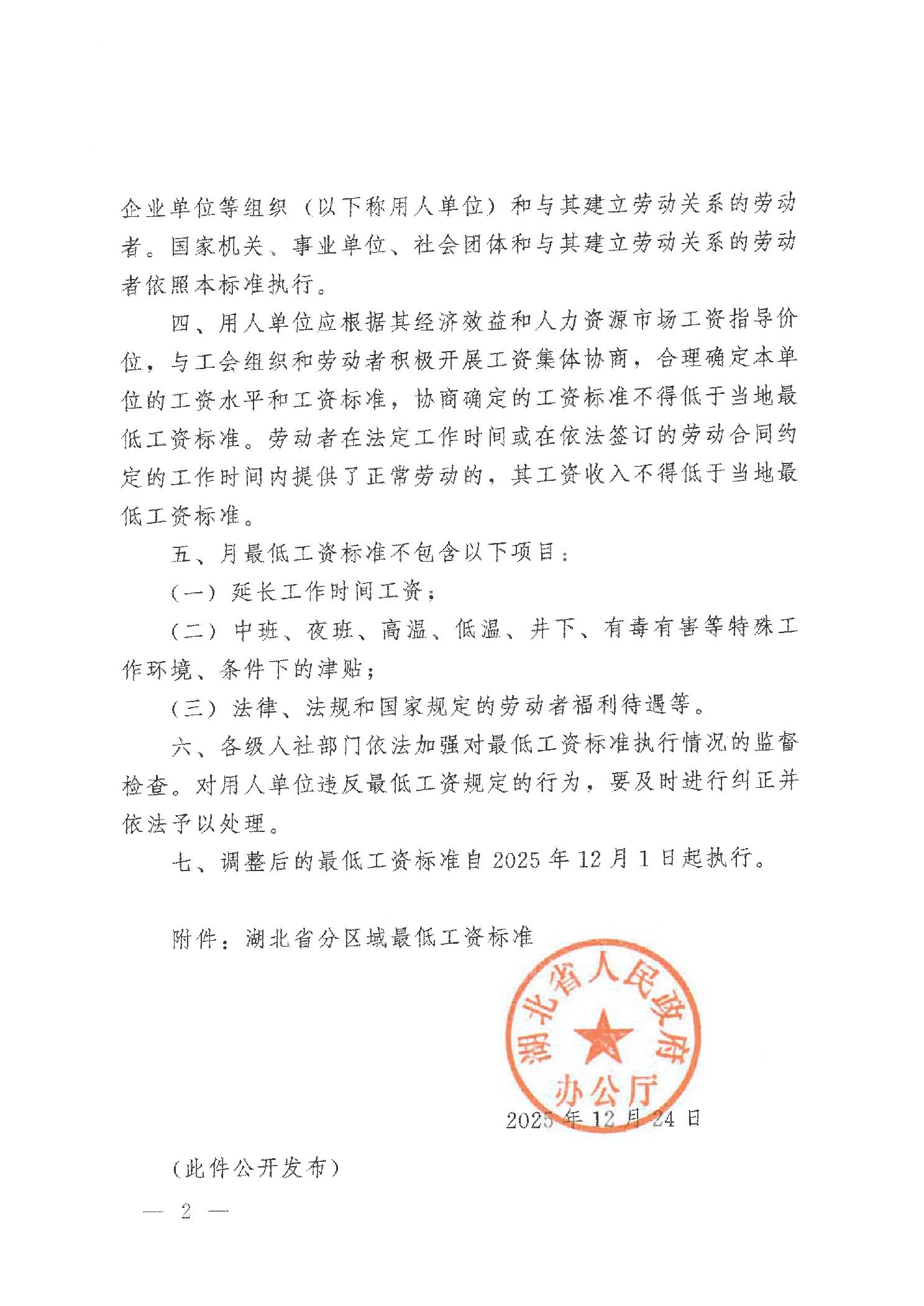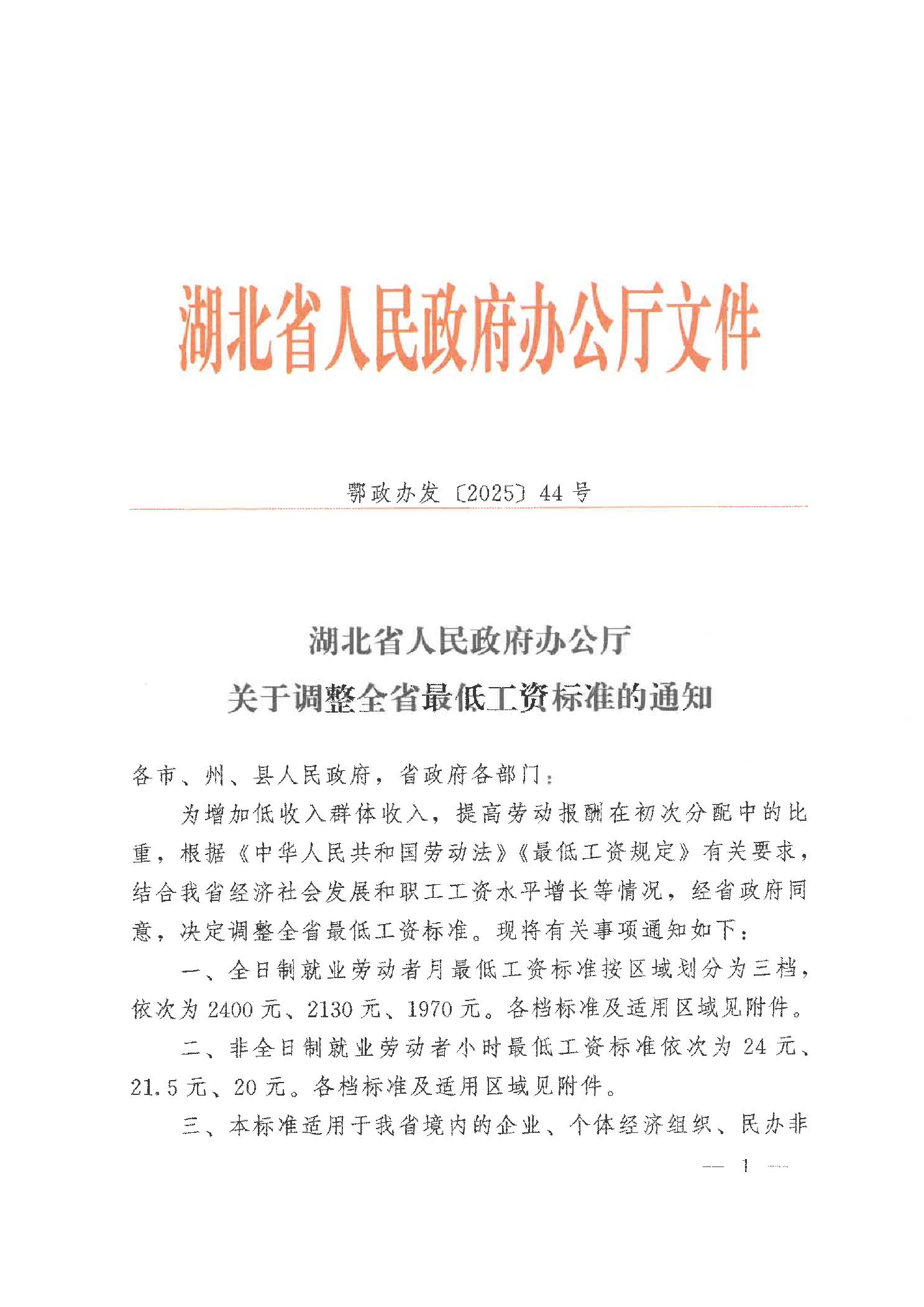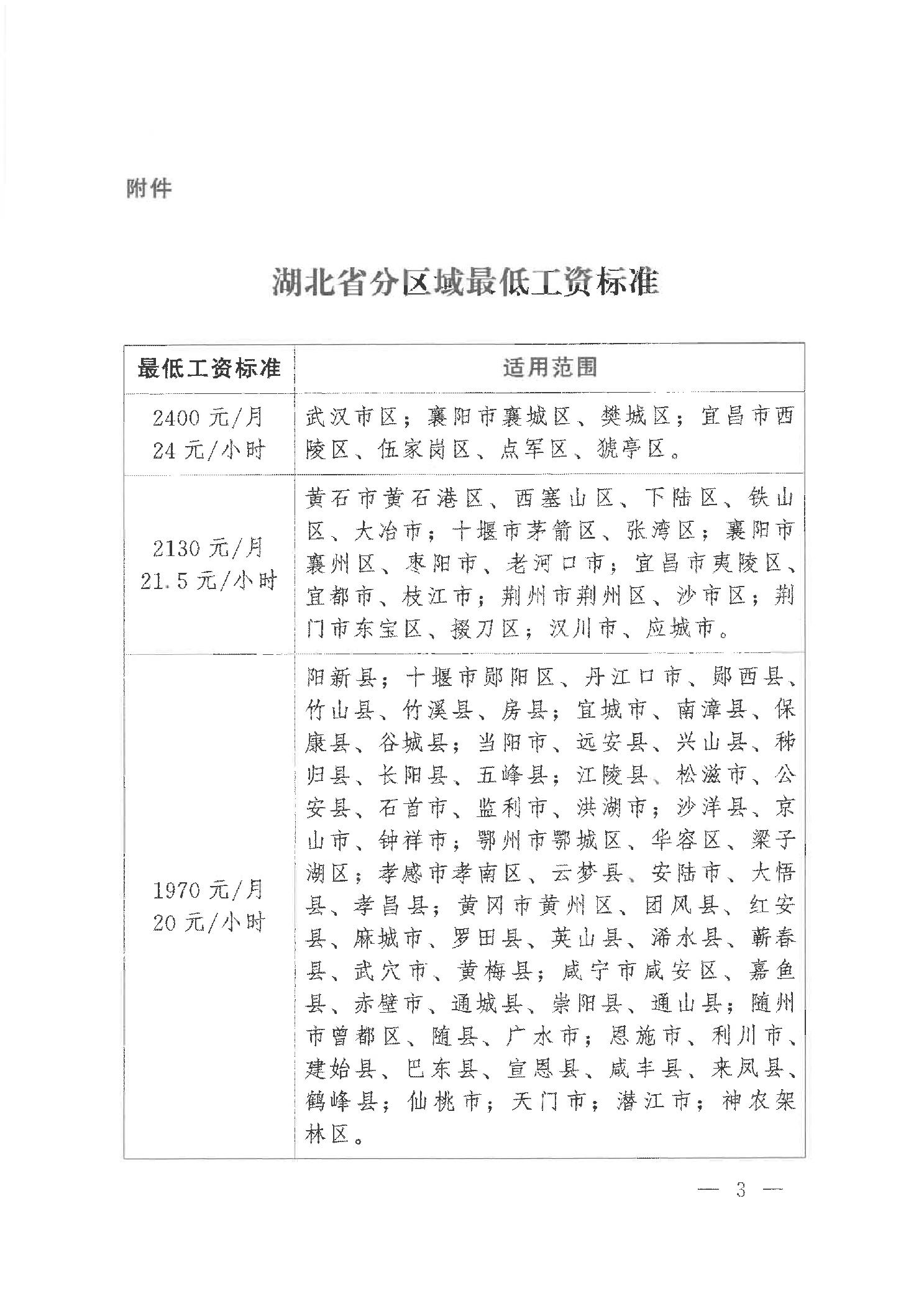 湖北省人民政府办公厅关于调整全省最低工资标准的通知