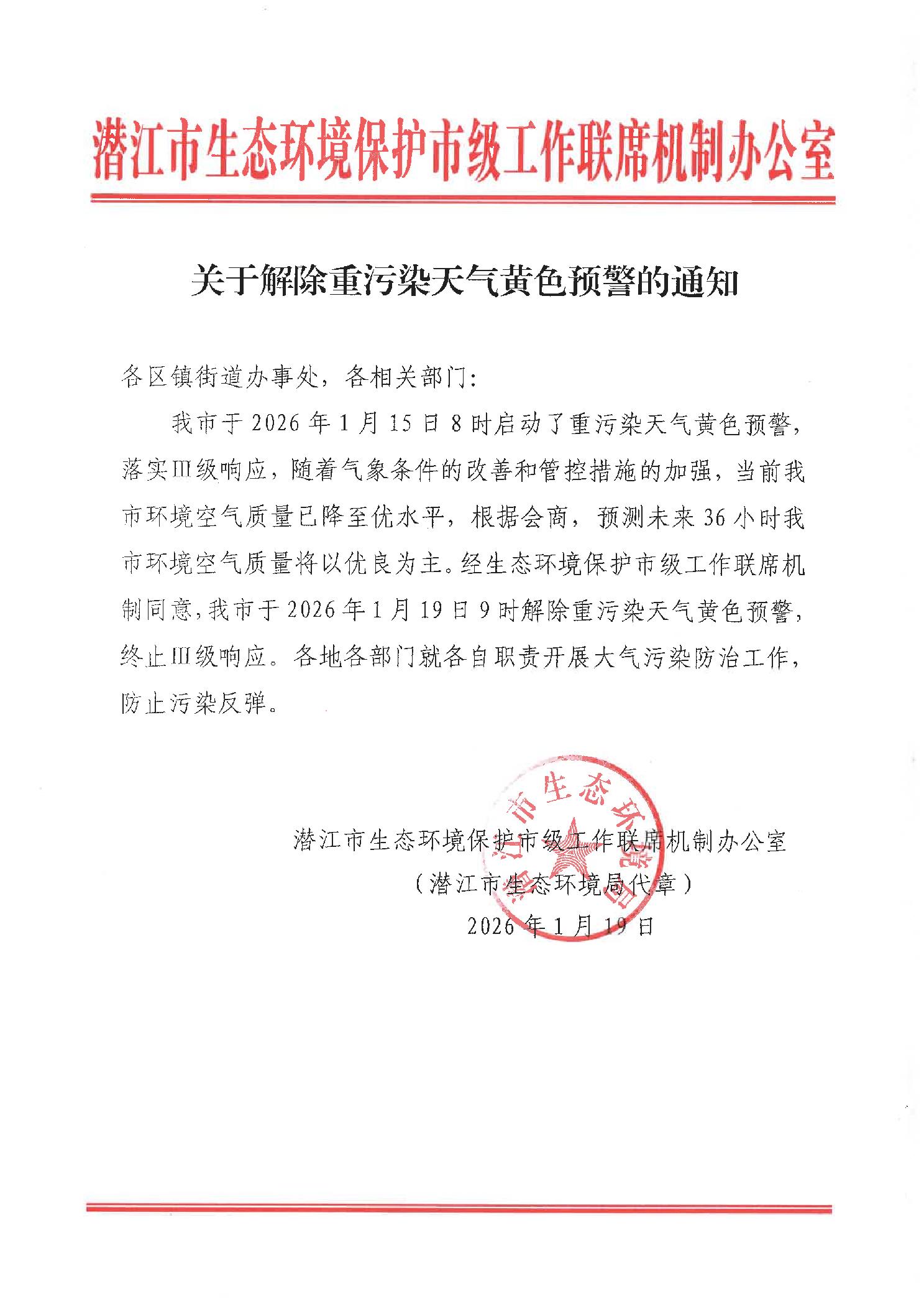 关于解除重污染天气黄色预警的通知