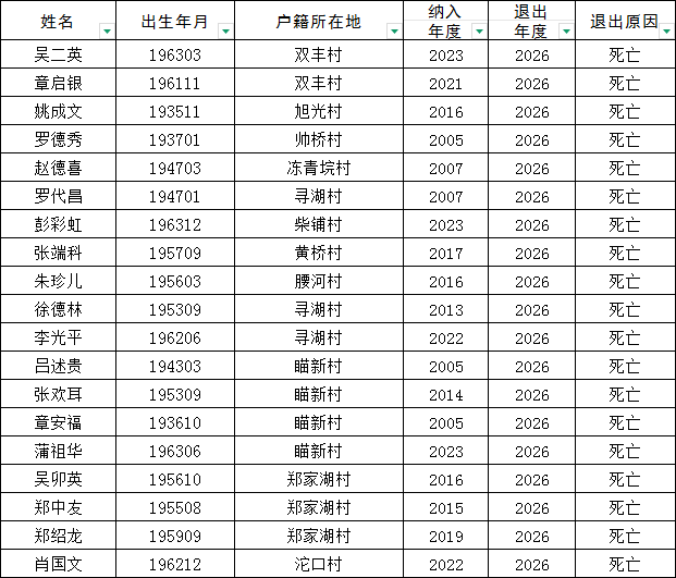 现将龙湾镇2026年农村部分计划生育家庭奖励扶助对象因本人死亡、独生子女死亡或伤残转特扶、户籍迁出、审批错误等原因不再符合农村奖扶条件的予以退出公示,如有异议,请举报。举报电话:潜江市卫生健康委员会07286231351、龙湾镇人民政府02786621006。