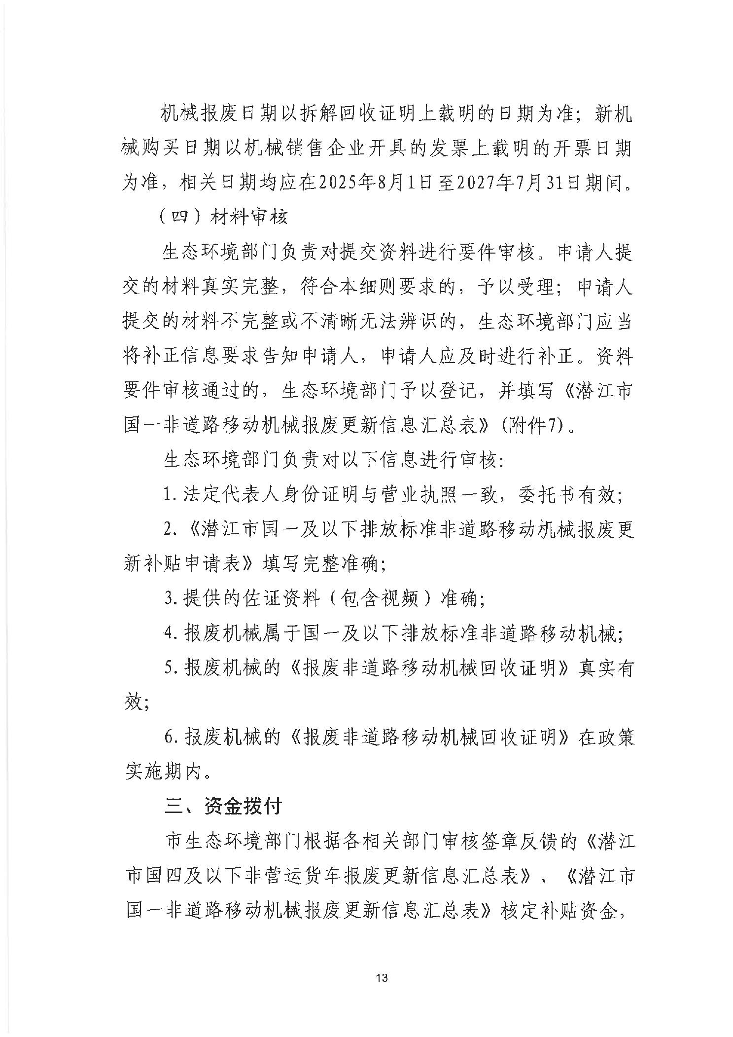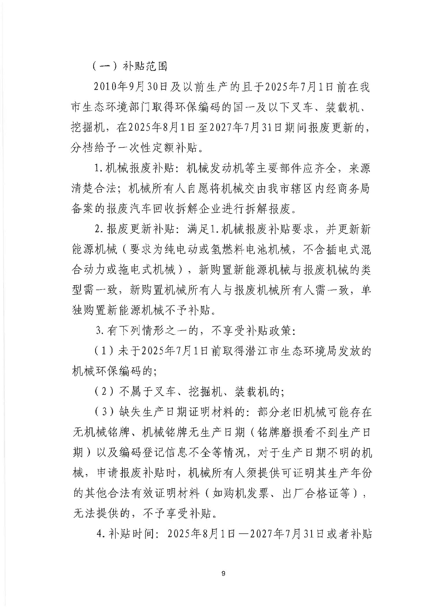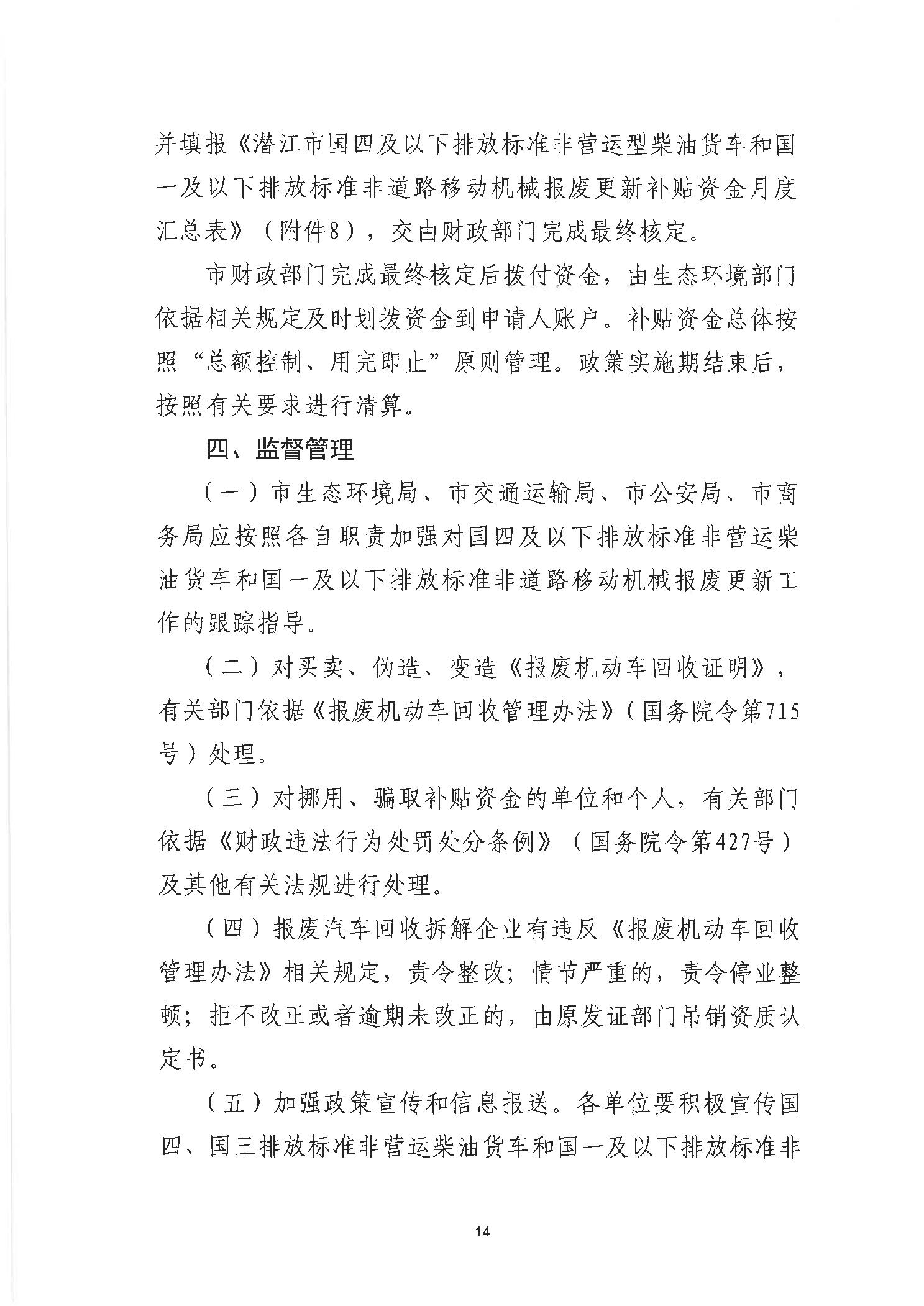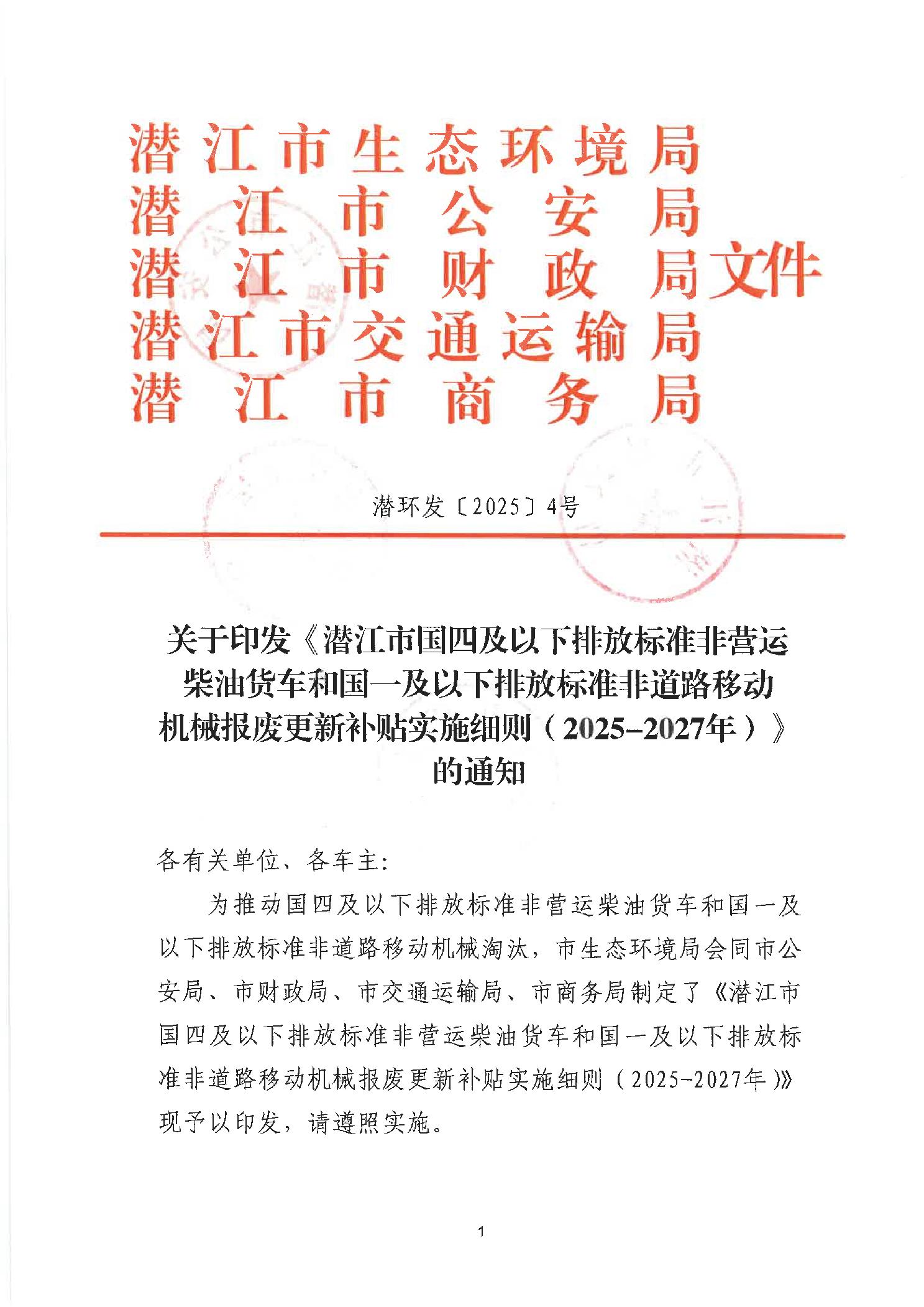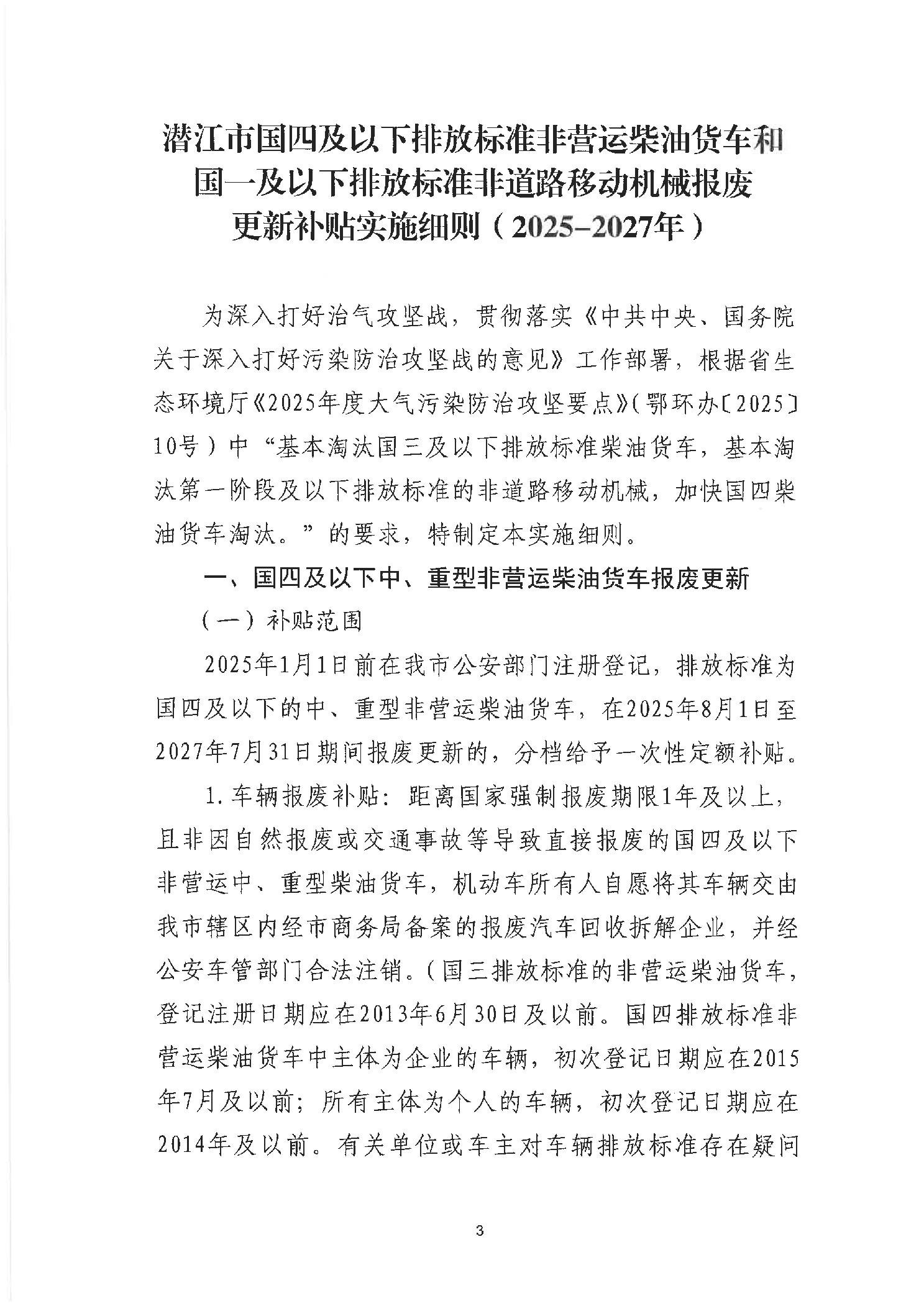 关于印发《潜江市国四及以下排放标准非营运柴油货车和国一及以下排放标准非道路移动机械报废更新补贴实施细则(2025-2027年)》的通知