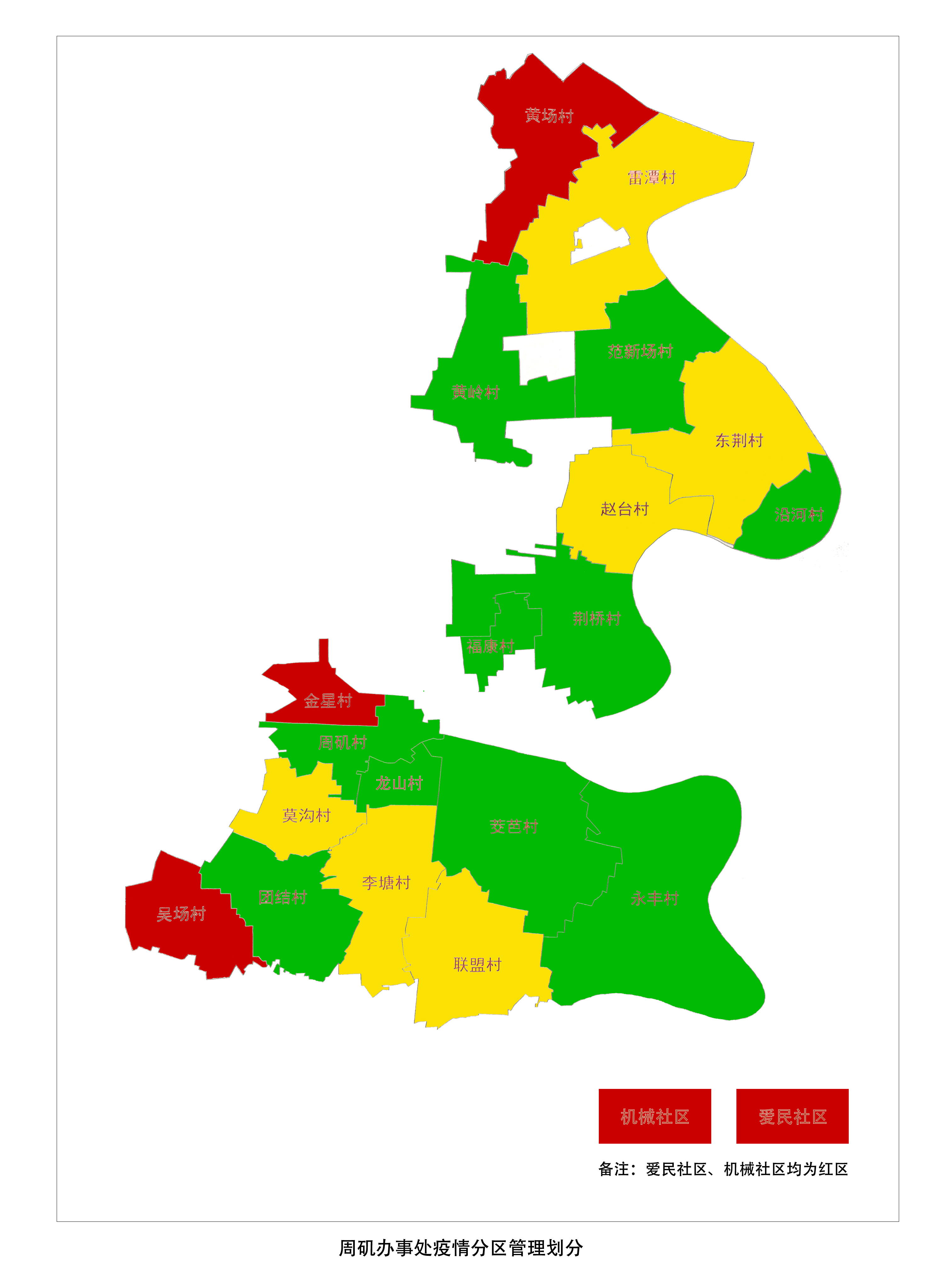 办事处根据确诊病例、疑似病例、无法排除新冠肺炎的发热人员、密切接触者“四类人员”数量,将全处21个村居划分为红区、黄区、绿区三类区域,实行分区差异化防控。