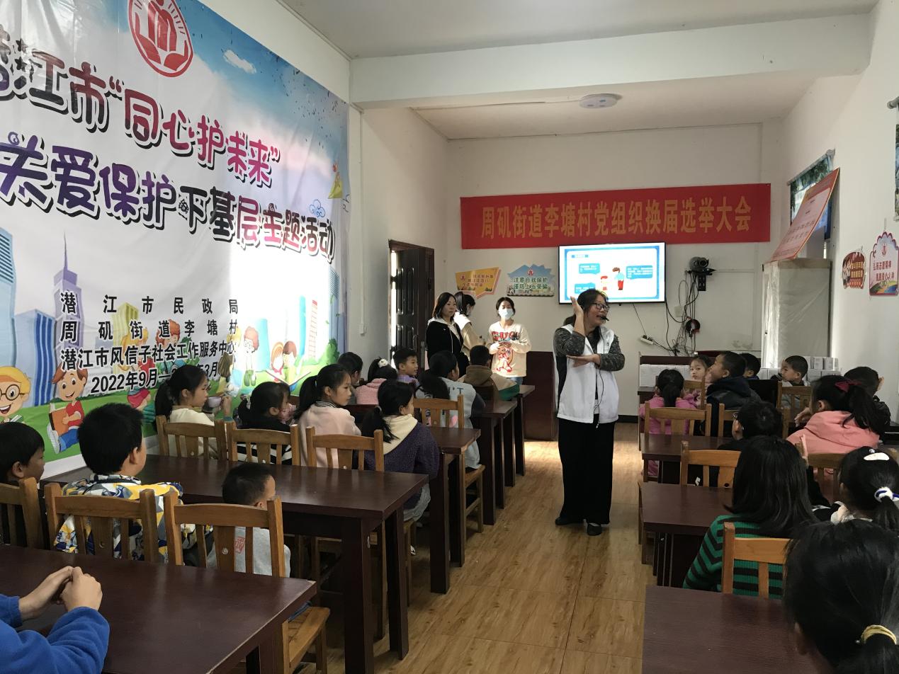 “哪位小朋友知道,如果爸爸妈妈不在家,有陌生人敲门,我们应该怎么办呀?”“要问清楚陌生人的名字,然后打电话给爸爸妈妈确认”“不开门,要等爸爸妈妈回来”11月6日,市民政局、潜江风信子社工走进周矶街道李塘村开展“安全教育”主题活动。